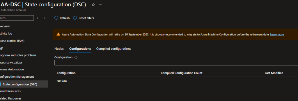 I tried to push the configuration to my WSUS-Arc enabled server but it failed. The problem here was that Microsoft is aggressively retiring the State configuration (DSC) feature and already deprecating things in certain regions. So for my region “switzerlandnorth” it is already only possible to work with the new feature Azure Machine Configuration.