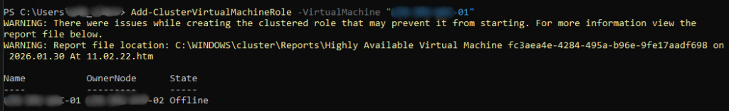 I got a warning as ouput and was worried first, but the system is giving out a warning because the state of the ClusterVirtualMachineRole os “Offline”.